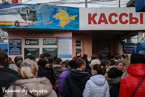 Еще больше очередь в кассу симферопольского автовокзала. Отключение электричества привело к остановке троллейбусов — главного общественного транспорта, связывавшего столицу нового российского региона с городами южного берега. На линии вывели автобусы, но количество касс, где можно купить билеты, осталось неизменным – в очереди к ним теперь можно стоять по полчаса.