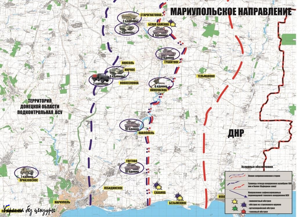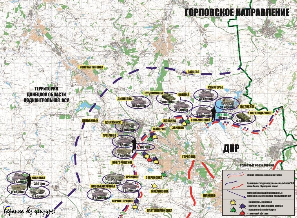 От отметил, что по данным разведки ДНР, украинские военные за прошедшую неделю подтянули к линии разграничения в различных населенных пунктах на Горловском, Мариупольском и Донецком направлениях 111 единиц артиллерии (в том числе САУ, БМ-21 «Град», Д-30), 166 танков, 147 единиц БМП и БТР, 26 автомобилей с боеприпасами и более 660 человек личного состава, в том числе и членов украинской экстремистской организации «Правый сектор»*.