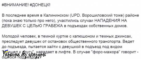 «(UPD. Ворошиловский тоже) районе (пока знаю только про него), участились случаи НАПАДЕНИЯ НА ДЕВУШЕК С ЦЕЛЬЮ ГРАБЕЖА в подъездах собственных домов».
