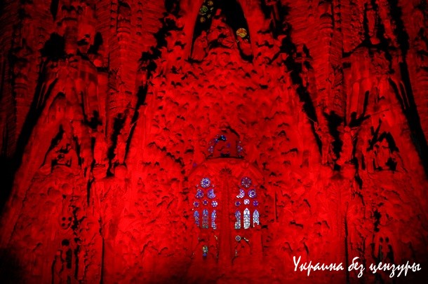 Собор Sagrada Familia в Барселоне, Испания, во Всемирный день борьбы со СПИДом осветили красной подцветкой