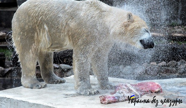 Один из белых медведей-близнецов ест праздничный обед в свой пятый день рождения в зоопарке Варшавы, Польша