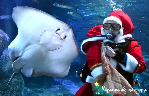 Директор комплекса Sea Life в Берлине в костюме Санта-Клауса в преддверии Рождества лично кормил обитателей гигантского аквариума