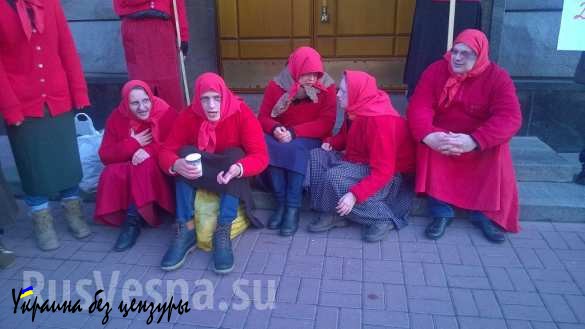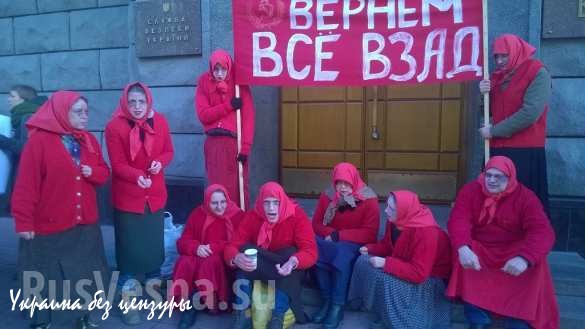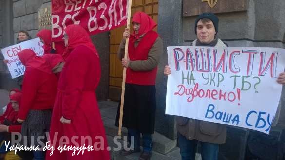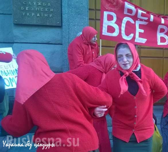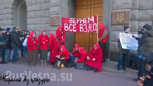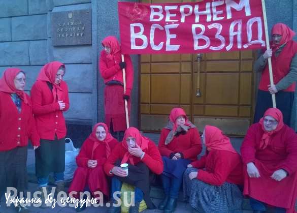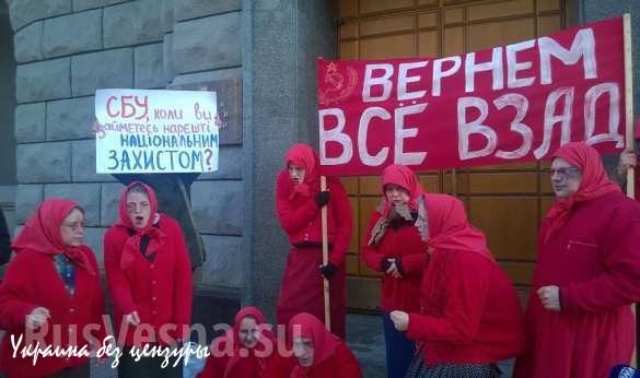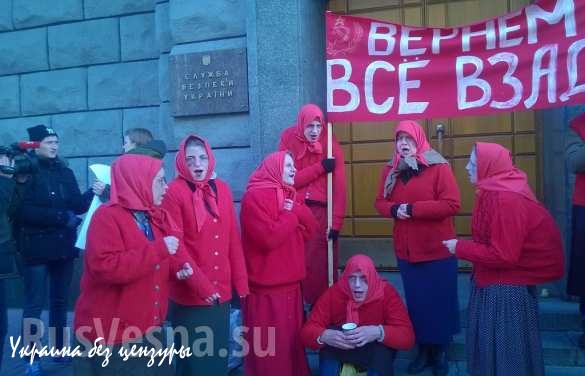 Около десятка активистов, одетых, по их задумке, как советские бабушки (в малиново-красные шерстяные кофты и платки), собрались сегодня у стен СБУ. Акция получила название «Вєрньом всьо взад». «Бабули» распевали песни вроде «И Ленин такой молодой», а также выкрикивали лозунги «За Ленина! За Сталина! За СБУ!».