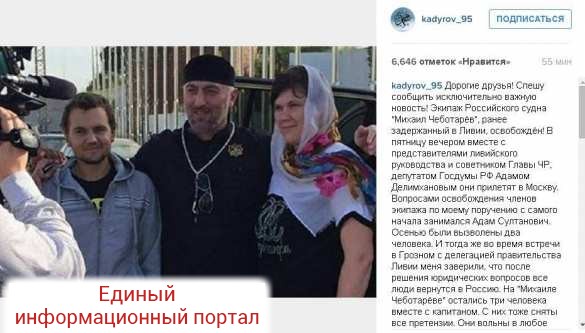 «Экипаж российского судна «Механик Чеботарёв», ранее задержанный в Ливии, освобожден. В пятницу вечером вместе с представителями ливийского руководства и советником главы ЧР, депутатом Госдумы РФ Адамом Делимхановым они прилетят в Москву, — написал Кадыров на своей странице в Instagram.