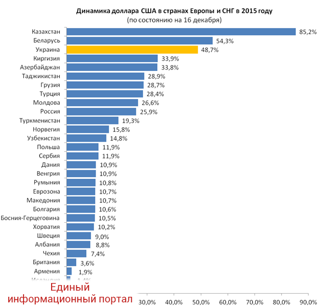 Украинская гривна по итогам 2015 года девальвировала на 48,7%, заняв третье место среди самых слабых валют стран Европы и СНГ.
