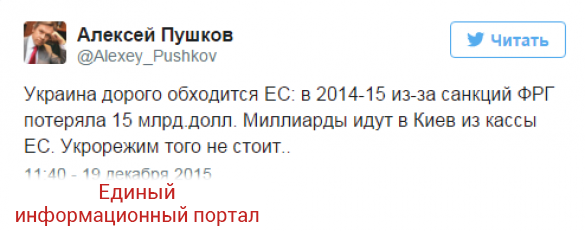 «Украина дорого обходится ЕС: в 2014–15 из-за санкций ФРГ потеряла $15 млрд. Миллиарды идут в Киев из кассы ЕС. Укрорежим того не стоит», — написал он в Twitter.