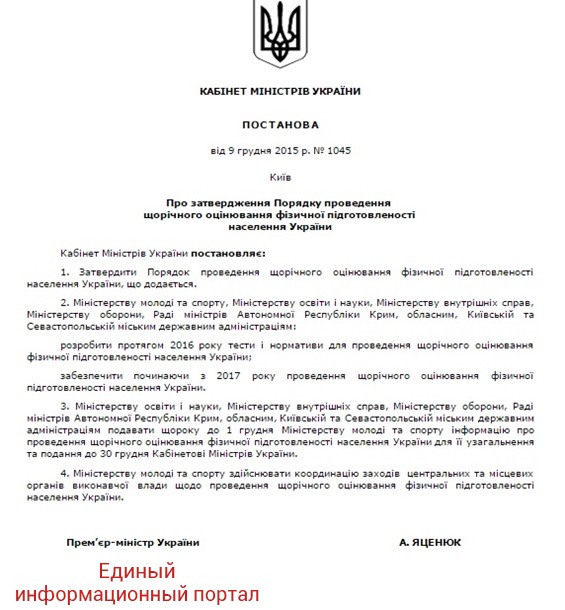 Согласно документу, украинский Кабмин поручил Министерству молодежи и спорта Украины, Министерству образования и науки Украины, Министерству внутренних дел Украины, Министерству обороны Украины, областным администрациям и Киевской городской госадминистрации разработать в течение 2016 года тесты и нормативы для проведения ежегодной оценки физической подготовки населения Украины и обеспечить начиная с 2017 года проведение такой подготовки.