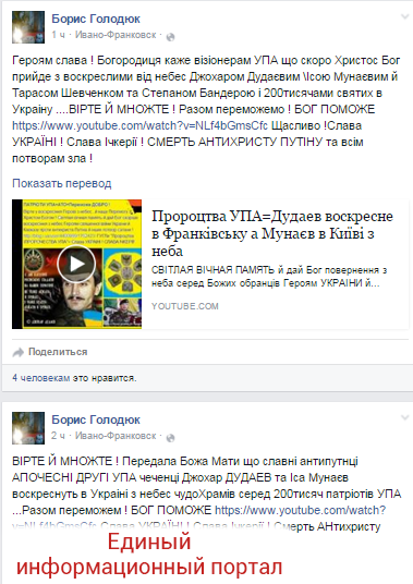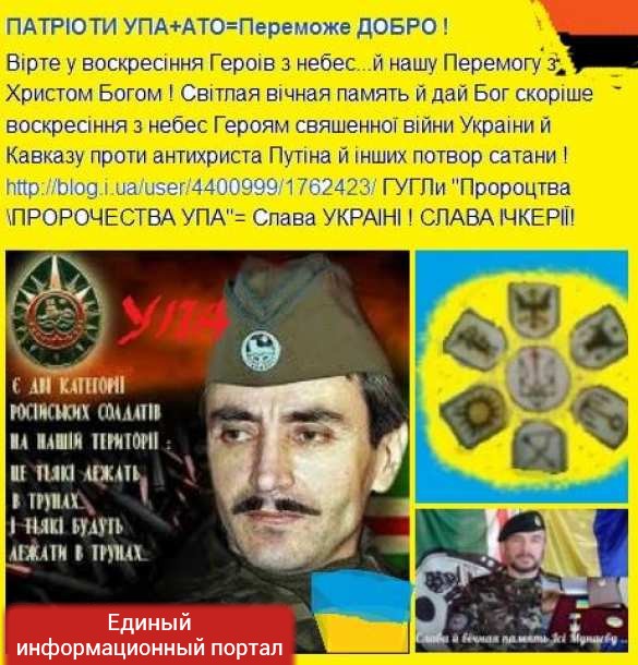 «ВЕРЬТЕ И РАСПРОСТРАНЯЙТЕ! Передала Богородица что славные антипутнцы из второй УПА чеченцы Джохар Дудаев и Мунаев воскреснут в Украини с небес, чудо в Храме среди 200 тысяч патриотов УПА… Вместе победим! Слава УКРАИНЕ! Слава Ичкерии! Смерть антихристу Путину и всем чудовищам ИМПЕРзла Москвы!».