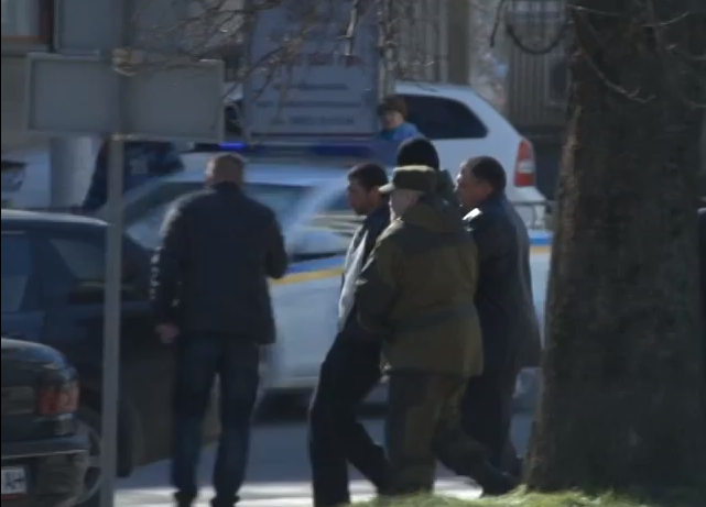 После этого на других видео можно увидеть, как после небольшой стычки люди в камуфляже хватают его и ведут в машину. На видео на 9-й минуте на заднем плане видно, как его выводят с площади. Возле машины он попытался сопротивляться, однако его силой посадили в машину.