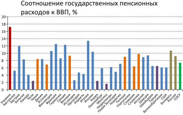По соотношению расходов на пенсии к размеру экономики Украина значительно опережает все развитые страны, а также своих соседей по Восточной Европе (включая Россию и Беларусь).