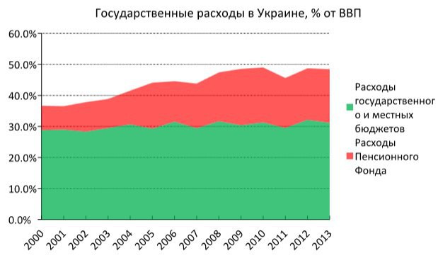 Фактически, именно растущие, как раковая опухоль, пенсионные расходы, привели к столь огромной доле государственных расходов в экономике Украины. Доля в ВВП расходов государственного и местных бюджетов с 2000 года практически не изменилась.