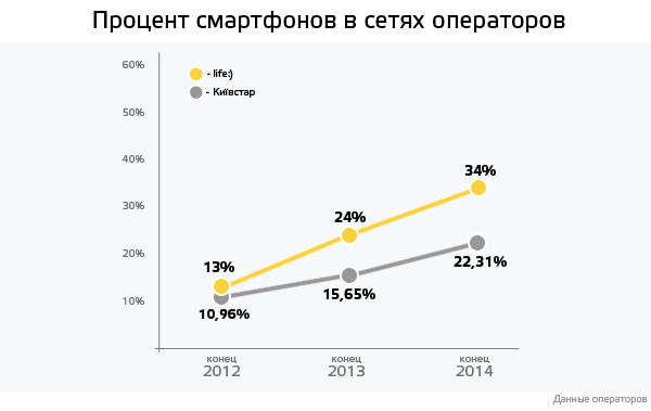 Единственным позитивным явлением на телеком-рынке стал заметный рост числа смартфонов в сетях операторов и практически полное доминирование смартфонов в рознице. По данным IDC, количество традиционных телефонов сократилось до 11% ($92,5 млн). Такая же доля в продажах ожидается и в следующем году. Для операторов большой процент смартфонов означает высокую долю абонентов, готовых к потреблению высокорентабельных услуг 3G - большинство игроков все же надеются запустить 3G во втором полугодии 2015-го. В то же время процент смартфонов в операторских сетях растет не так быстро, как их розничные продажи. Это свидетельствует о том, что украинцы расстаются со своими старыми трубками неохотно.