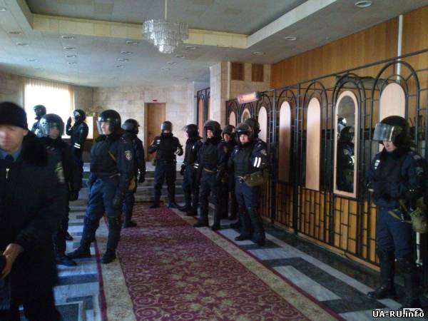 Как сообщают работники ОГА, милиция подготовила пожарные брансбойтами. Вероятно, при попытке штурма помещения, людей поливать водой, - предполагают работники.