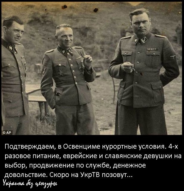 "Условия проживания в концлагере были просто "прекрасные: во-первых, вдали от линии фронта, было радио с захватывающими душу речами Геббельса, была добротная дезинфекция заключенных, что обеспечивало нашу санитарную безопасность при отправке их в газовые печи, претензий к питанию не было... Вообщем, чувствовали мы себя у немцев, как дорогие гости!"