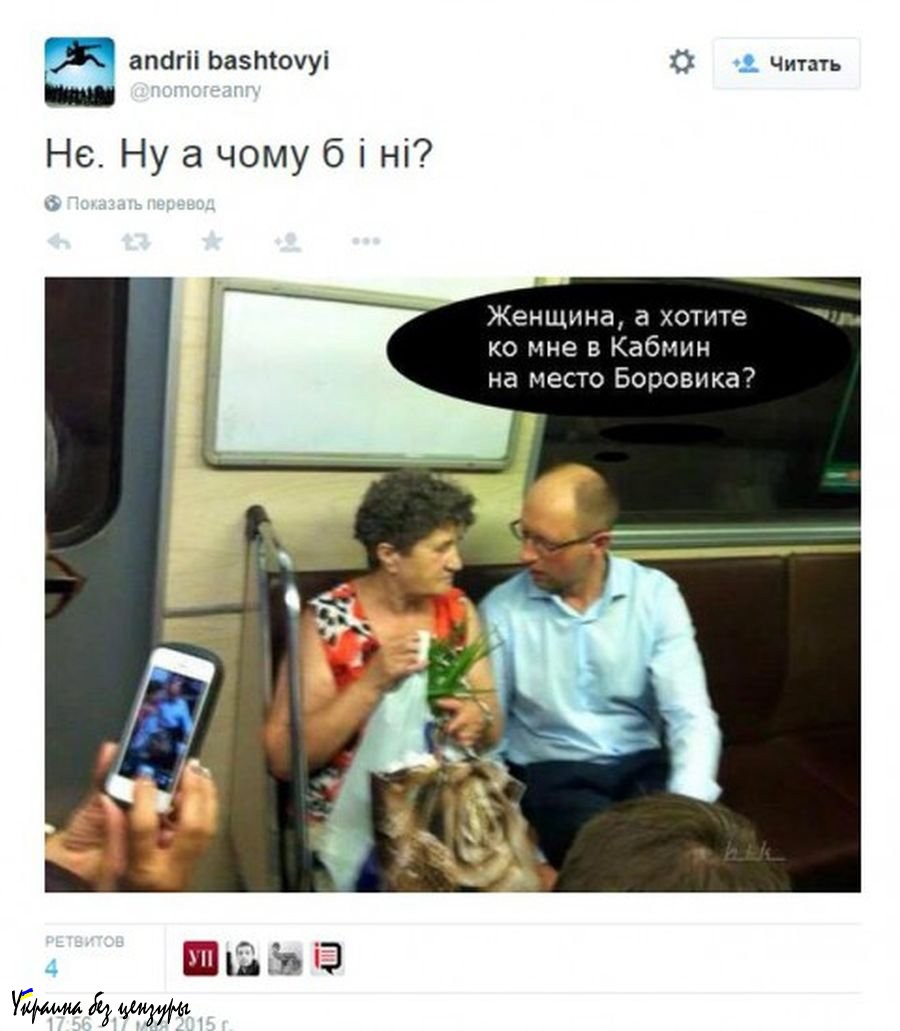 NOVOROSSIA TODAYПремьер-министр Украины Арсений Яценюк продолжает падать в пучины «дешевого пиара», стремясь спасти свою трещащую по швам карьеру премьер-министра многострадальной Украины. На этот раз его «застукали» в вагоне метро, где он общался с пожилой украинкой. С тюльпанами.