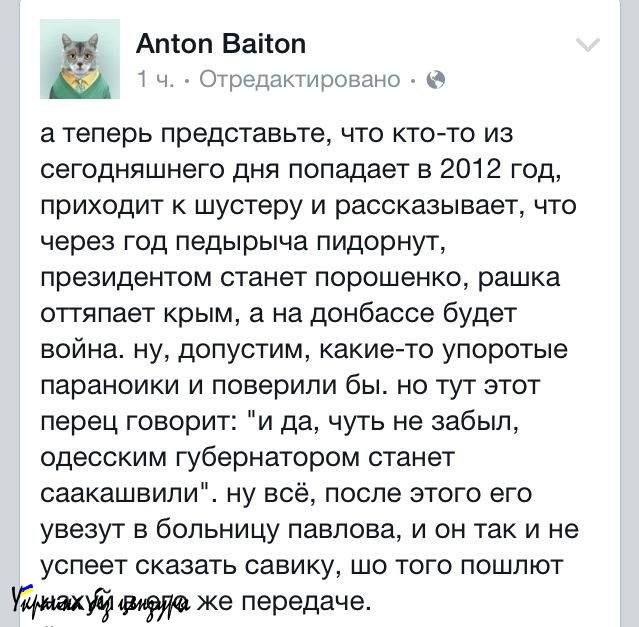Виталия Кличко цитирует LifeNews:Саакашвили победил коррупцию в Грузии. Поэтому, конечно, Саакашвили подсказывает мне, как лучше реализовать те или иные проекты, чтобы использовать положительный опыт Грузии в Киеве.«Положительный опыт Грузии» эпохи Саакашвили – это жесточайший разгон акций оппозиции, распад страны, снижения уровня бытовой коррупции на фоне роста коррупции государственного масштаба, пытки заключённых в грузинских тюрьмах, многократный рост государственного долга, сдача суверенитета Вашингтону. В принципе, многие из этих пунктов Украина «отлично» реализовала и без губернатора Одесской области Саакашвили. То ли ещё будет...Ты не Одессит-Мишка...Непредсказуем и беспечен
