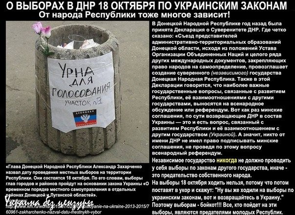 «Думаю, если будет положительный результат Донецка, мы поддержим. У нас тоже достаточно много мест, где это можно использовать», – сказал в свою очередь Дейнего.ВзглядКомментарий. То есть, как я и в прошлый раз писал, Широкино не просто сдали. Оно должно было ускорить слив республик в Украину и стать моделью совместного патрулирования ополченцами и укровенными населенных пунктов, находящихся под контролем ополчения. Ради этой цели кремлины приказали своим марионеткам в ДНР вывезли ополченцев из Широкино. Все делалось в расчете на сговорчивость Украины. Но слава богу, Украина еще раз дала понять, что сговорчивость - это не про нее. Поэтому теперь очень трудно будет заставить ополчение опять демилитаризовывать в одностороннем порядке Горловку, ДАП, Первомайск, Дебальцево и т.д. К слову сказать, про Дебальцево будет следующая новость.МОСКВА, 6 июл — ua-ru.info. Местные выборы в городе Дебальцево 18 октября проводиться не будут, поскольку это не вписывается в минские соглашения, заявил полпред самопровозглашенной Донецкой народной республики Денис Пушилин."Те населенные пункты, которые не входят пока что в зону нашей юрисдикции, пока там не будут проводиться выборы", — заявил Пушилин журналистам в Москве."Дебальцево пока находится за линией (разграничения) от 19 сентября, и это не вписывается в комплекс мер, однако у нас есть другие инструменты, чтобы там государственные институты работали на полную мощность", — добавил постпред ДНР.ua-ru.infoКомментарий. В комментариях в мой блог очень часто заходят адепты ХПП и начинают, на мою критику минского сговора. мне ездят по ушам, что минские соглашения обычная пустая бумажка, подписанная, чтобы показать миролюбие России и Донбасса. И что мол, их никто соблюдать и выполнять не собираются. Они здесь правы, но не совсем. Это Украина не собиралась и не собирается соблюдать и выполнять минские соглашения.А Кремль и его марионетки в ДЛНР полностью выполняют минские соглашения. Даже в одностороннем порядке они это делают. Вот и на этот раз, в объявленных Захарченко выборах в ДНР 18 октября по украинскому законодательству, которые Украина собирается законом запретить, в Дебальцево проведение выборов не планируется. Так как по минским соглашениям от 19 сентября прошлого года, Дебальцево, где зимой шли кровопролитные бои, не находится под юрисдикцией ДНР. Вы представляете сейчас моральное состояние ополченцев, только что узнавших, что они зря освобождали Дебальцево и зря там в котле жарили украинскую армию? Потому что оно понимаете ли, не вписывается в комплекс мер, по словам Петушилина. Теперь я не исключаю, что сливщики в Кремле могут дать команду Хазарченко и Петушилину "демилитаризовать" вслед за Широкино и Дебальцево.МОСКВА, 6 июл — ua-ru.info. Компромисс по отводу в Донбассе техники калибром менее 100 миллиметров найден, во вторник на встрече контактной группы по этому вопросу будет поставлена точка, заявил полпред самопровозглашенной Донецкой народной республики на переговорах контактной группы Денис Пушилин."Не обязательно подписание, но возможно завтра поставить точку в обсуждении технических деталей, потому что, в принципе, компромисс найден", — сказал Пушилин на пресс-конференции в Москве.ua-ru.infoКомментарий. Мало того, что ополченцев заставили отвести всю тяжелую техники с передовой в глубокий тыл 