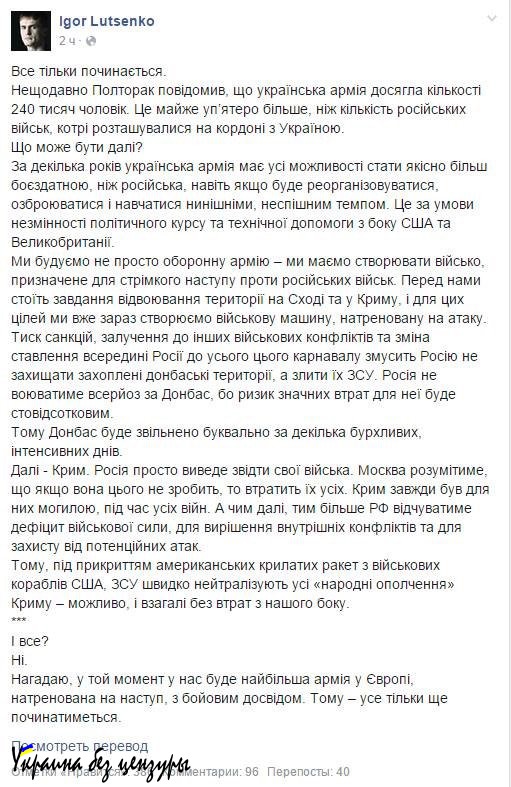 Самая мощная в Европпе Украинская армия реформируется при помощи США и Великобритании с целью нанесения решительного удара по российским войскам на Донбассе и в Крыму, заявил депутат Верховной Рады Игорь Луценко.«Все только начинается… украинская армия достигла количества в 240 тысяч человек. Это почти впятеро больше, чем количество российских войск, которые расположились на границе с Украиной.Что может быть дальше?За несколько лет украинская армия имеет все возможности стать качественно более боеспособной, чем российская, даже если будет реорганизовываться, вооружаться и обучаться нынешними, неспешным темпом. Это при условии неизменности политического курса и технической помощи со стороны США и Великобритании.Мы строим не просто оборонительную армию – мы должны создавать войско, предназначенное для стремительного наступления против русских войск. Перед нами стоит задача отвоевания территории на Востоке и в Крыму, и для этих целей мы уже сейчас создаем военную машину, натренированную на атаку.Давление санкций, привлечение к другим военным конфликтам и изменение отношения внутри России ко всему этому карнавалу заставит Россию не защищать захваченные донбасские территории, а слить их ВСУ. Россия не будет воевать всерьез за Донбассе, поскольку риск значительных потерь для нее будет стопроцентным.Поэтому Донбасс будет освобожден буквально за несколько бурных, интенсивных дней.Дальше — Крым. Россия просто выведет оттуда свои войска. Москва будет понимать, что если она этого не сделает, то потеряет их всех. Крым всегда был для них могилой, во время всех войн. А чем дальше, тем больше РФ будет испытывать дефицит военной силы для решения внутренних конфликтов и для защиты от потенциальных атак.Поэтому, под прикрытием американских крылатых ракет с военных кораблей США, ВСУ быстро нейтрализуют все «народные ополчения» Крыму – возможно, и вообще без потерь с нашей стороны», — говорится в прогнозе Луценко, опубликованном на его страничке в социальной сети.Депутат дает понять, что на Донбассе и Крыме украинская группировка не остановится.«И все? Нет. Напомню, в тот момент у нас будет самая большая армия в Европе, натренированная на наступление, с боевым опытом. Поэтому – все только еще начинается«, — обещает рогулям Луценко..