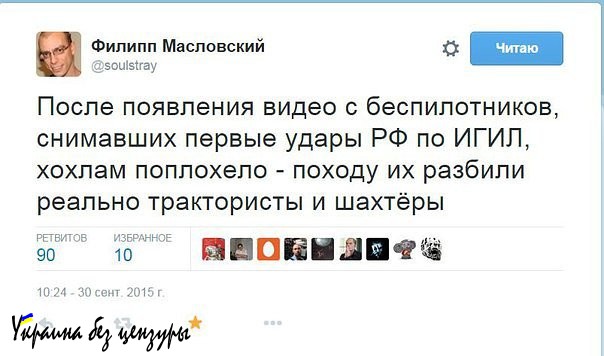 Украинская сторона в резкой форме критикует контртеррористическую операцию в Сирии. В украинских СМИ тиражируются фейки о том, что в результате авиаударов ВКС РФ «гибнут мирные жители». Нужно подчеркнуть, что с такой позицией выступают официальные власти и СМИ государства, которые аплодировали авиационному удару ВВС Украины по центру Луганска, приведшему к реальным жертвам среди гражданского населения.