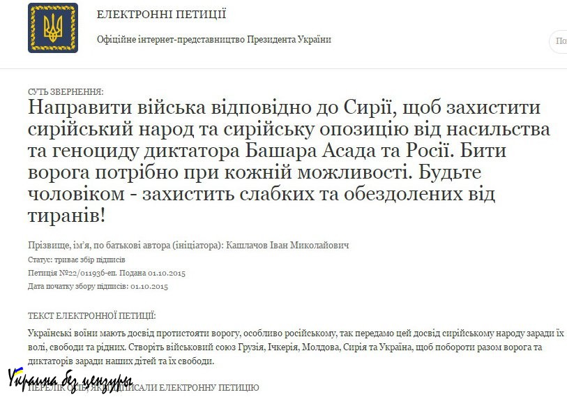 Чтобы увеличить на Украине число психически здоровых людей, президенту Порошенко необходимо принять во внимание и положительно отреагировать на появившуюся на его официальном сайте электронную петицию об отправке в Сирию украинского контингента...С такой предложением выступил украинский политолог, директор Фонда «Украинская политика» Кость Бондаренко.«Уважаемый Петр Алексеевич! На сайте Президента появилась петиция о направлении украинских военнослужащих в Сирию для борьбы с Башаром Асадом и российскими войсками. Хорошая идея! Прошу автоматически считать каждую подпись под петицией заявлением о направлении в Сирию в качестве добровольца и отправить туда всех тех, кто поддержит данное обращение. По крайней мере, в Украине увеличится процент психически здоровых людей», — написал политолог на своей странице в FacebookС такой предложением выступил бандеровский политолог, директор Фонда «Украинская политика» Кость Бондаренко.«Уважаемый Петр Алексеевич! На сайте Президента появилась петиция о направлении украинских военнослужащих в Сирию для борьбы с Башаром Асадом и российскими войсками. Хорошая идея! Прошу автоматически считать каждую подпись под петицией заявлением о направлении в Сирию в качестве добровольца и отправить туда всех тех, кто поддержит данное обращение. По крайней мере, в Украине увеличится процент психически здоровых людей», — написал политолог на своей странице в Facebook.